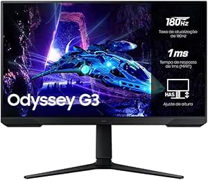 Gamer Samsung Odyssey G3", 27", 180Hz, 1ms, Ajuste de Altura, Freesync, DP, HDMI, FHD, Preto, (-9%) por R$ 989,00.